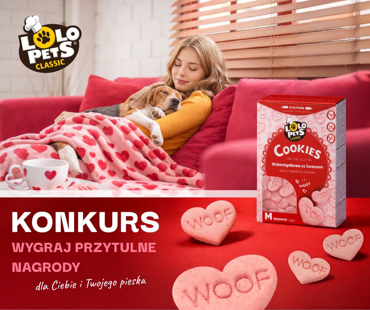 1. Dodaj pod postem konkursowym na Facebooku w komentarzu walentynkowe zdjęcie ze swoim psim przyjacielem – przytulasy, buziaki, chill na kanapie, serduszka… pełna dowolność!